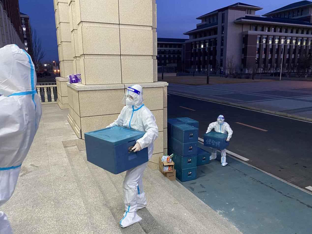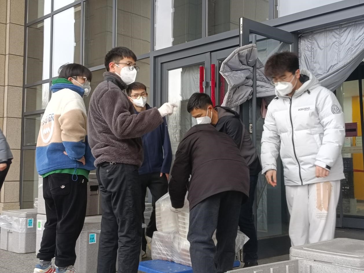 研究生志愿者在辅导员老师的号召下主动承担起北苑四公寓全楼物资配送任务,迅速成立了三支志愿者队伍:第一支由2019级党支部书记潘得新带领的5人志愿先锋队,协助楼长负责全楼整体工作;第二支由2021级党支部书记高磊带领的30人纵向配餐志愿者队伍,负责将门口的所有物资转运分发给各楼层同学;第三支由日本女优