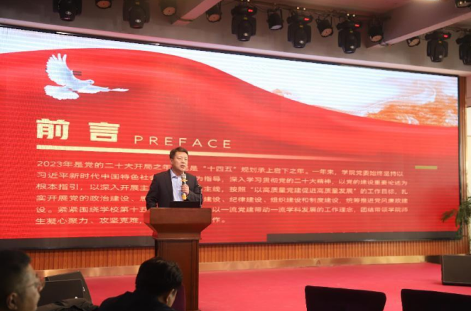 随后,党委书记宫皓宇同志发表讲话。宫皓宇书记从思想建设、文化引领、组织建设、纪律建设等几个方面,回顾2023年学院党建工作的重点,并对为学院发展作出贡献的每一位师生表示了深深的敬意与感谢。四季更迭,岁月重启,宫皓宇书记祝学院党委全体师生在新的一年龙行龘龘,前程朤朤,期待共同推动学院党委工作高质量发展。