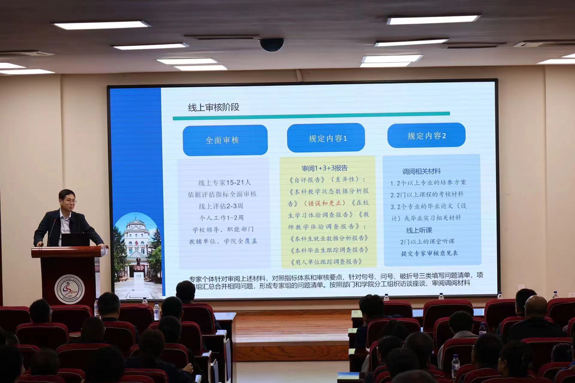 金老师的辅导报告分为专家考察方式、学院现场考察、主要教学环节质量标准、课堂教学、线上访谈等五个方面展开,每个方面他都从专家的维度、学院负责人的维度、教学管理者的维度、教师的维度和学生的维度进行了抽茧剥丝的生动讲解,会场不时爆发热烈掌声。金老师作为教育部高等学校本科教育教学工作审核评估专家,在辅导报告中还对审核评估的内涵进行了讲解,本科教育教学审核评估是确保人才培养中心地位和本科教育教学核心地位的一项重要工作,以评促建、以评促改、以评促管、以评促强是评估遵循和依据的原则,也将推动学校和学院积极构建自觉、自省、自律、自查、自纠的大学质量文化。