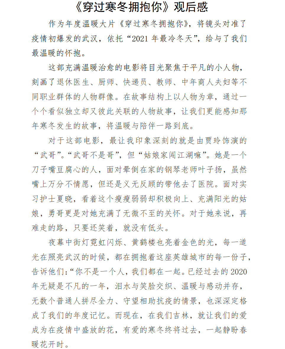 这部电影聚焦于2020年1月23日武汉宣布封城后的特殊时期,以温暖和治愈为主基调,刻画了普通市民守望相助、真挚动人的爱情群像。快递员阿勇、骑手武哥、钢琴老师叶子扬、中年夫妇刘亚兰和李宏宇、退休老医生谢咏琴和餐厅老板沛爷等等人物的故事,展现了疫情下爱给予他们的挺身而出的勇气和力量。他们以笑做盾,以爱为矛,冲破凛冽寒冬和恐惧,勇敢拥抱。同学们深切地感受到了爱在武汉的烟火气下蔓延,爱能够抵御一切苦难,最终创造奇迹。