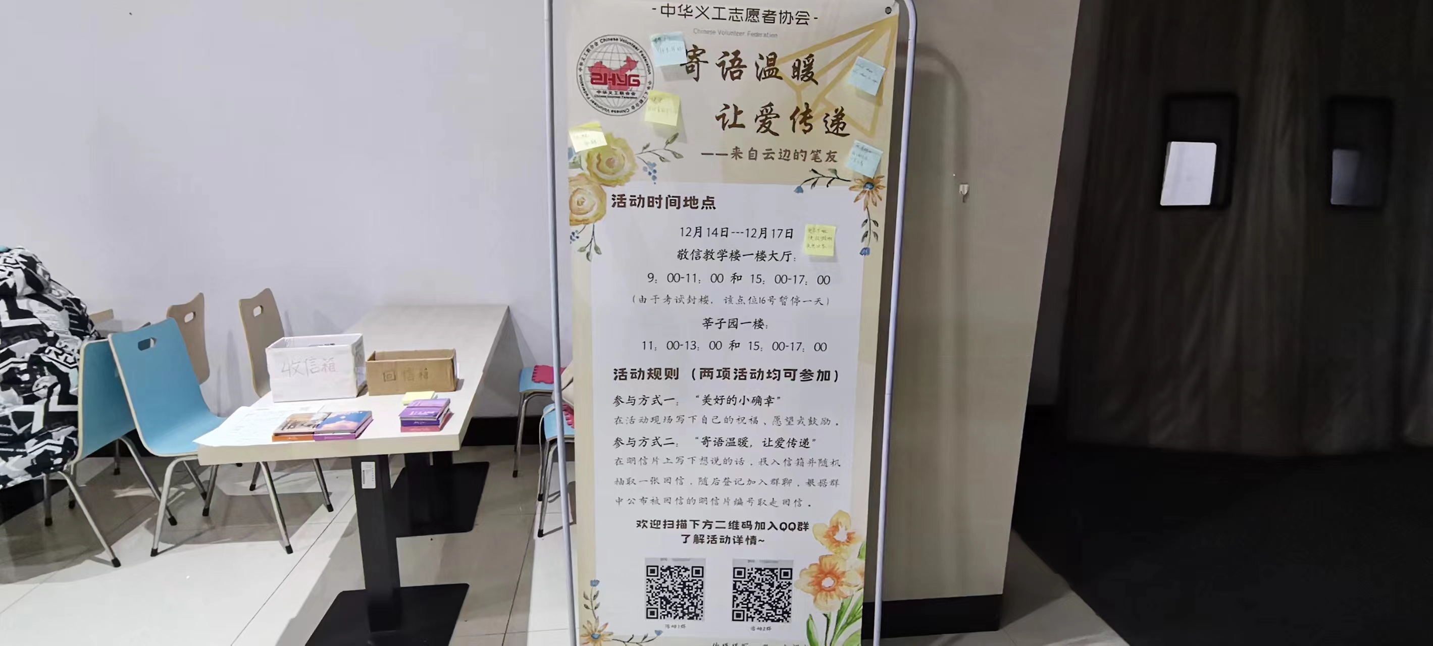 为促进校园文化交流、增强同学之间友谊。中华义工志愿者协会在考试月和新的一年来临之际举办“寄语温暖,让爱传递”活动,希望能够缓解同学们考试月的焦虑和压力,在新的一年给彼此送上最真诚的祝福,传达校园正能量,营造和谐、温馨的校园氛围。12月14日-12月17日,中华义工志愿者协会在莘子园一楼和敬信教学楼一楼大厅举办了“寄语温暖,让爱传递——来自云边的笔友”校园寄语活动。