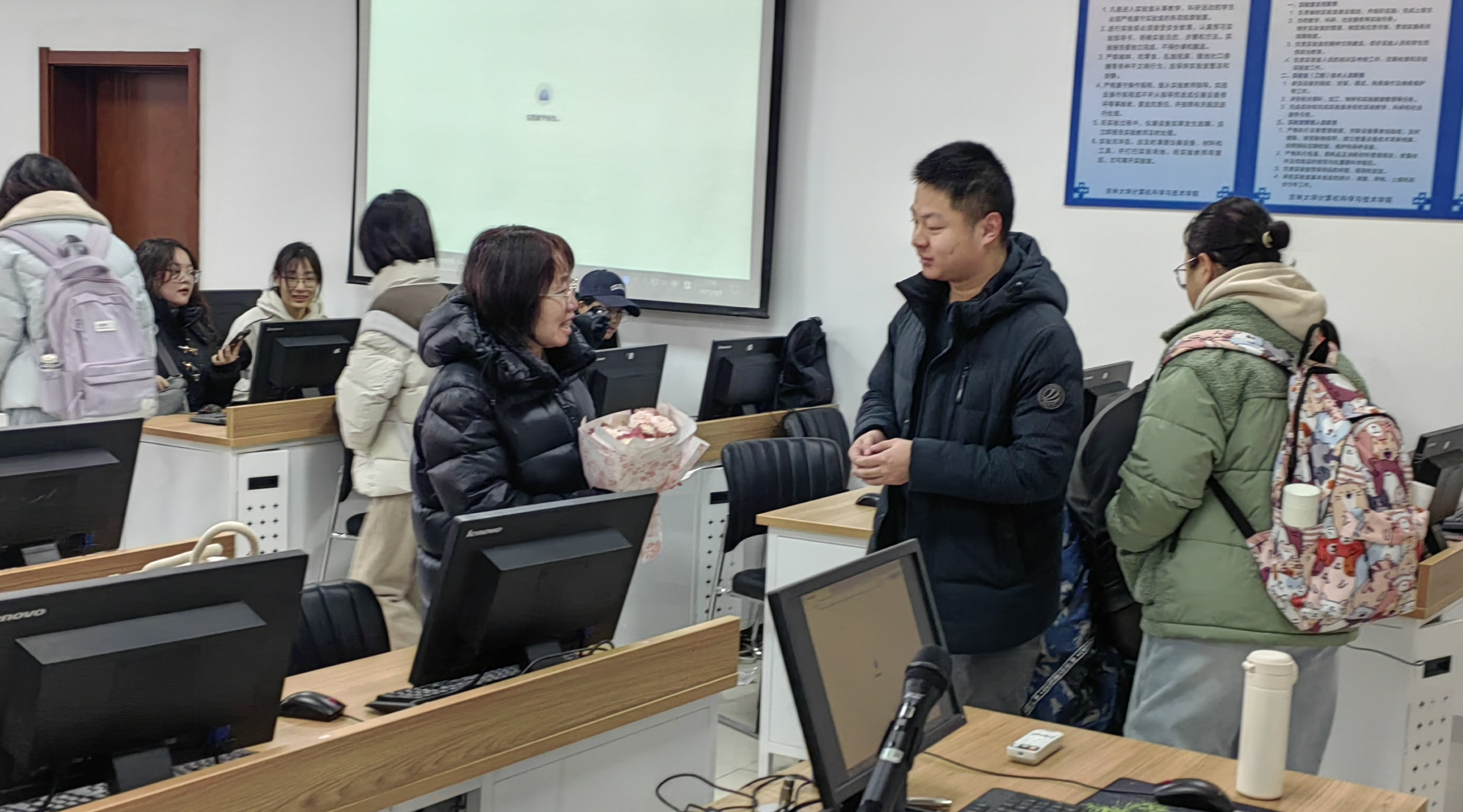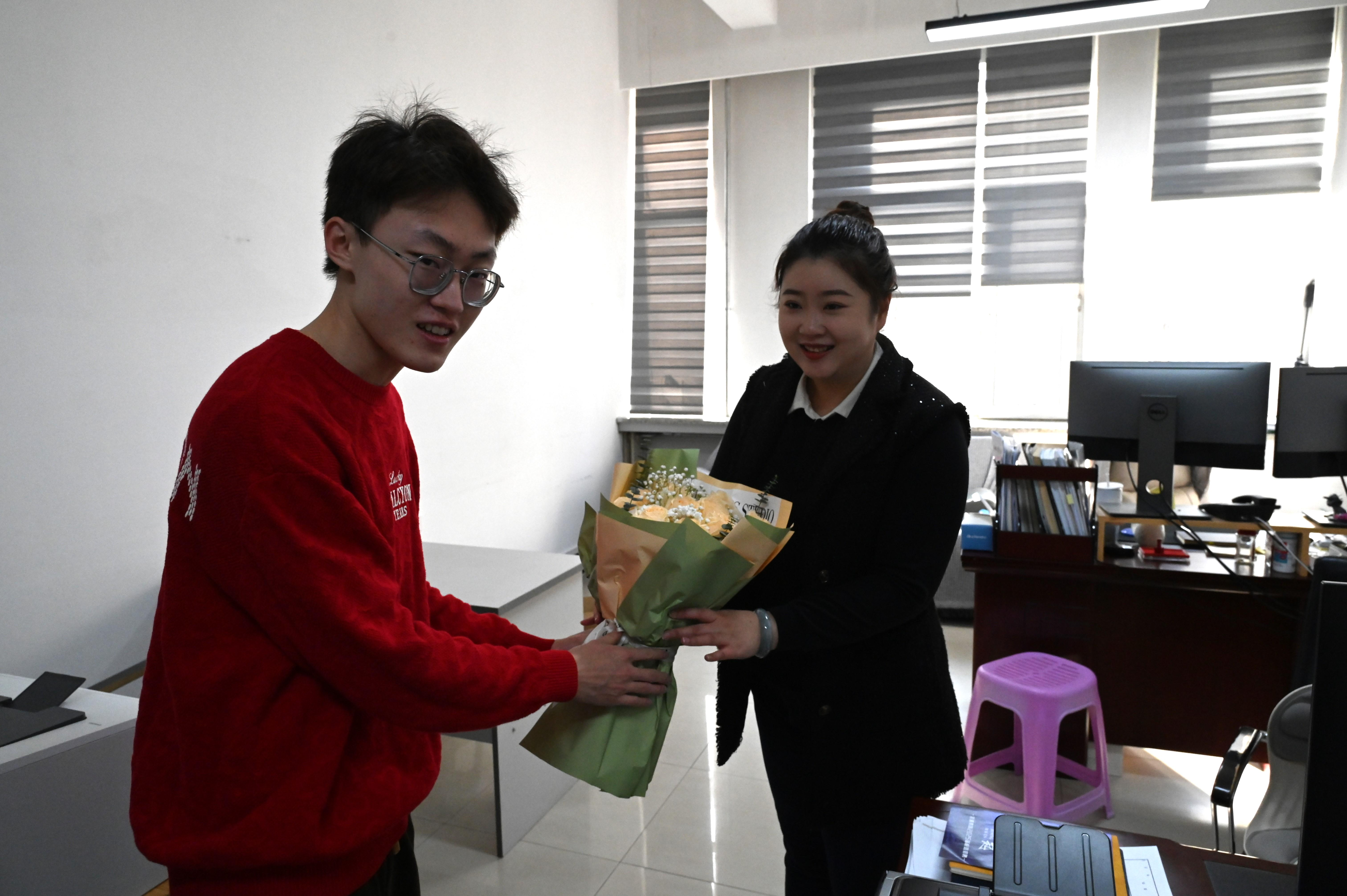 考虑到 3 月 8 日是休息日,大家决定提前在 3 月 7 日将这份温暖送达,任课老师的花束由各班班长负责领取,课堂上,他们手捧鲜花,走上讲台,代表全班同学向老师鞠躬,并说道:“老师,节日快乐!感谢您一直以来的辛勤付出。”老师们的脸上露出欣慰的笑容,纷纷表示,这份心意比任何语言都来得更加珍贵,非常感谢同学们的心意。与此同时,学生会成员们组成送花小队,前往行政老师的办公室,大家对同学们的到来感到十分惊喜,学生将精心挑选的鲜花递到每位老师的手中,表达他们对老师辛勤付出的感激之情。