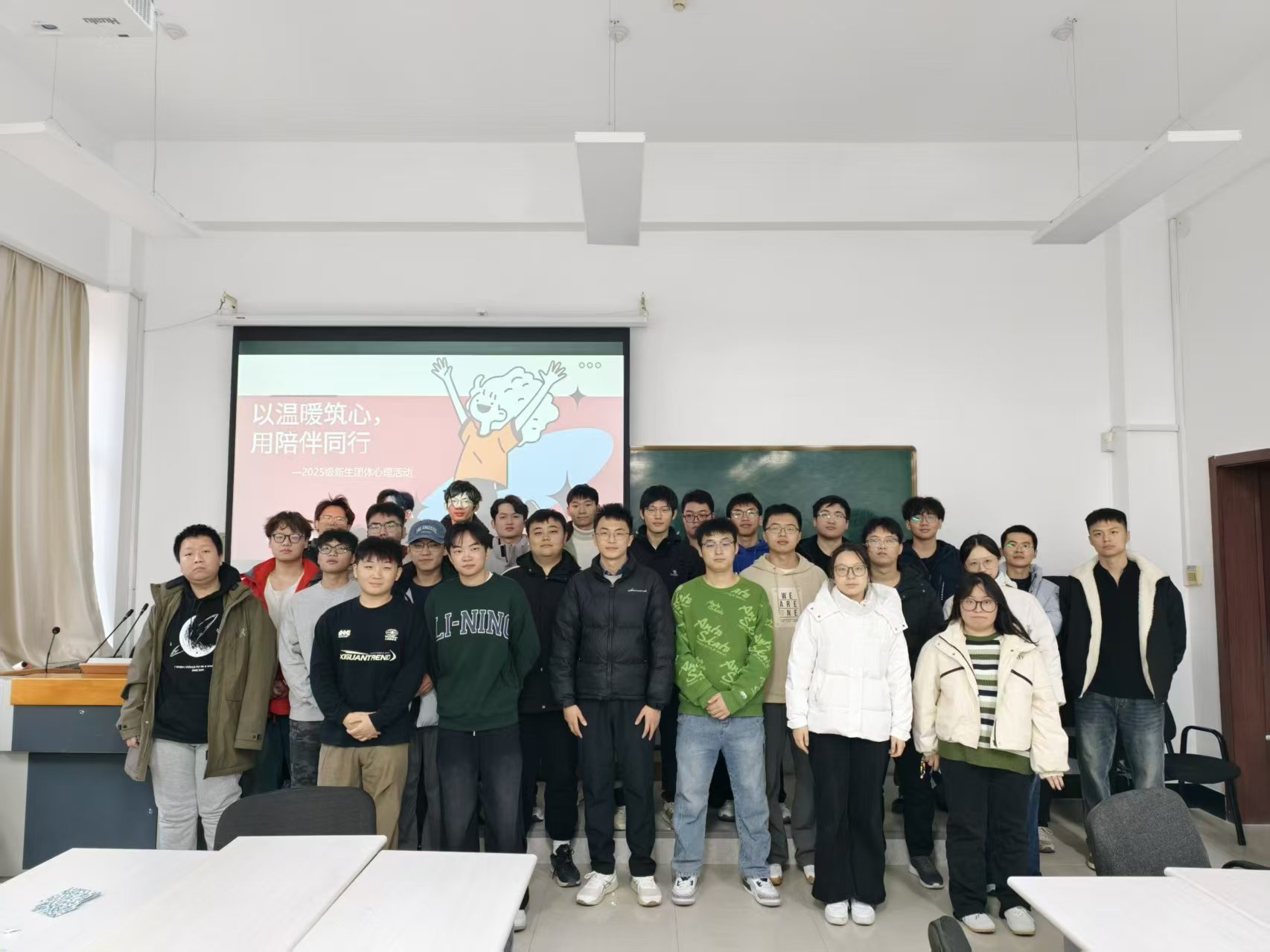 在王湘浩楼A124分场次为2025级新生开展团体心理辅导主题班会。活动由学院朋辈心理辅导员罗晓晴主持,各班班代与新生志愿者通力协作,现场暖意融融、活力涌动。