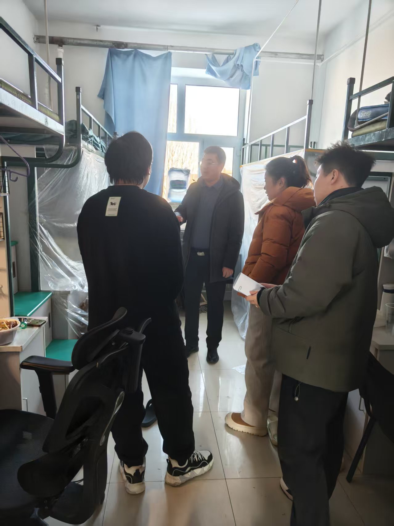 检查过程中,工作组首先对照研究生离校信息台账逐一细致核对,询问未离校学生的计划离校时间、返程交通安排和假期去向,确保每一位学生的离、返校信息全程可追溯、底数清、情况明。针对即将启动的学生公寓电气系统改造工程,个人物品规范收纳是此次检查的核心要点。工作组深入各研究生宿舍实地查看,现场指导同学们将衣物、书籍、电子设备等个人物品分类整理打包,同时反复提醒大家妥善保管个人财物,确保改造期间财物安全不受影响。