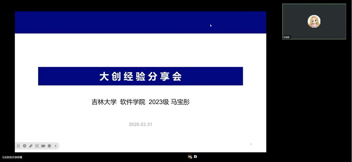 于3月31日在线上举办2026年大创经验分享会。本次活动邀请2023级优秀学生马宝彤同学担任主讲,围绕同学们关注的重点问题展开系统讲解,力求为同学们提供切实可行的经验借鉴、明确清晰的行动路径和系统合理的备战策略。
