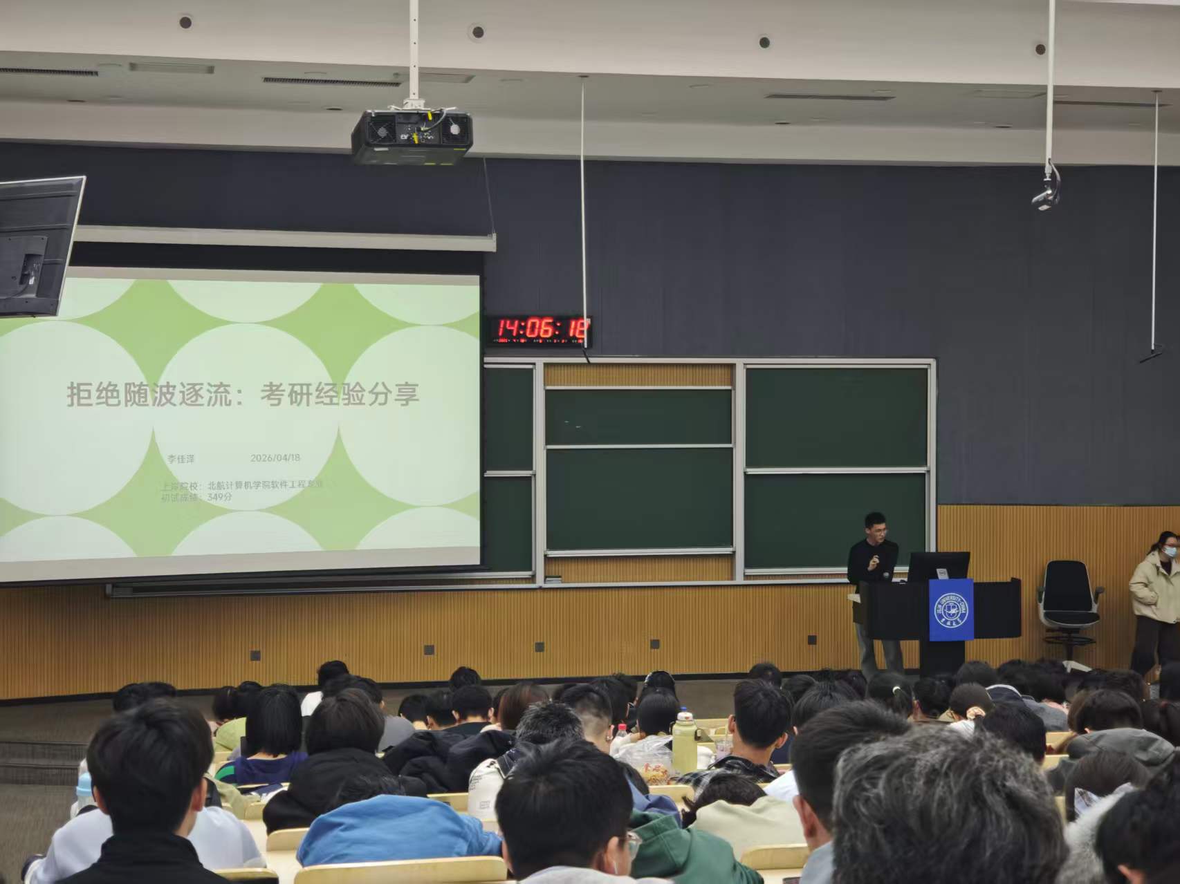 随后,考取北京航空航天大学软件工程的李佳泽进行分享。他以自身升学经历为例阐释理性择校的重要性。通过对比院校不同专业的录取分数与竞争形势,他提醒同学们摒弃盲目跟风的报考心态,结合自身学习进度与抗压能力合理定位。他强调,本科阶段的课程基础与英语积累尤为关键,优异的学业绩点既是保研竞争的核心优势,也是考研复试中综合能力的重要体现。他建议大家重视计算机核心课程学习,提前筑牢升学根基。此外,他鼓励同学们明确升学目标,结伴互助共同备考,保持健康作息与良好心态,从容应对升学挑战。